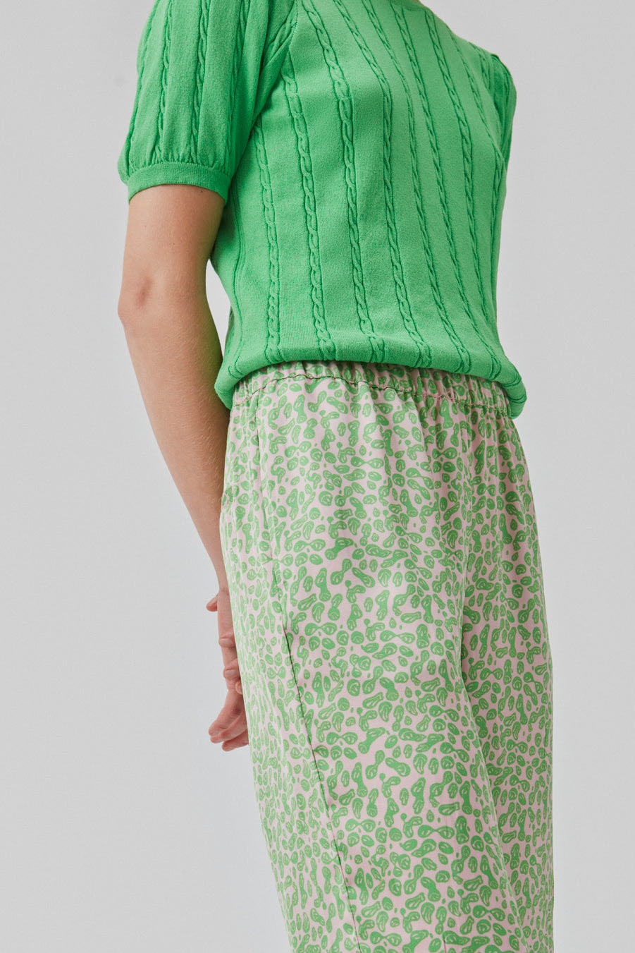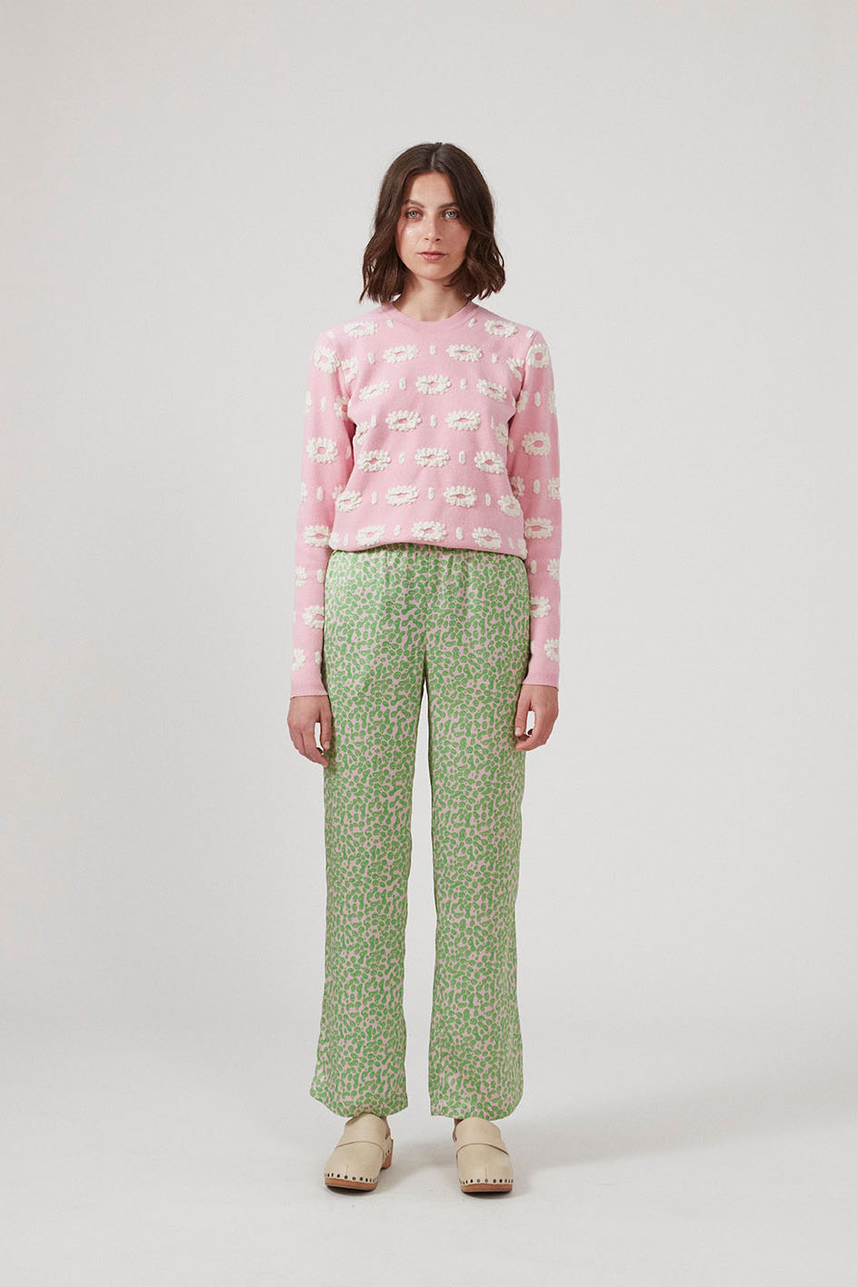 Die ClarkeMD Print Hose hat gerade, weite Beine und eine mittlere Taille mit verdecktem Gummizug. Die Hose ist aus recyceltem Polyester mit einem Smiley-Aufdruck hergestellt.
