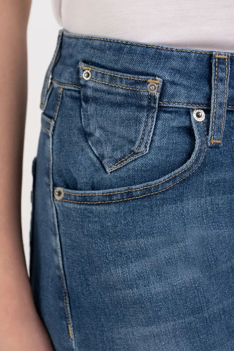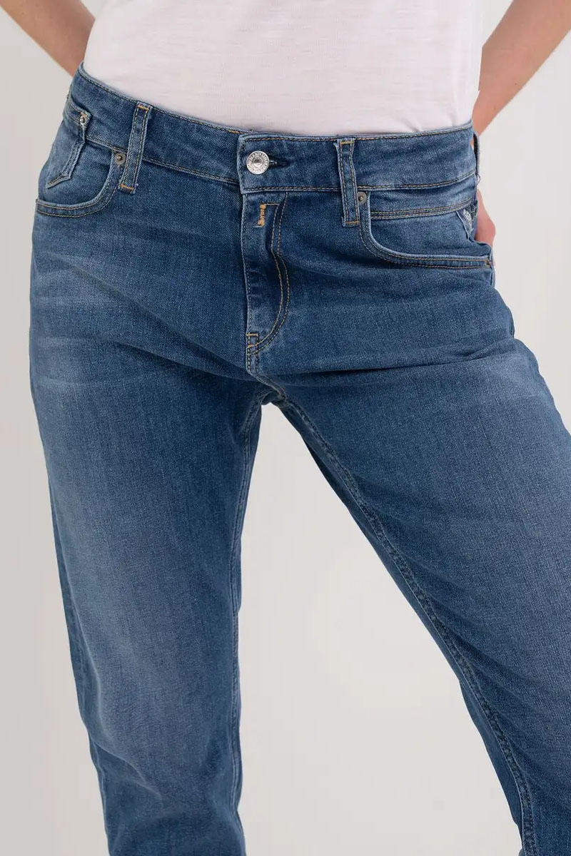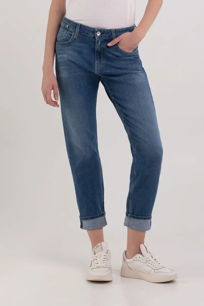 Boy Fit Jeans mit normaler Taillenpassform, tiefem Schritt, zur Unterkante engem Beinschnitt und entspannter Passform. Das Modell ist aus indigoblauem 11 oz-Baumwollstretch-Denim mit mittlerer Stonewashed-Behandlung gefertigt. Eine Enzymbehandlung und manuell durchgeführte Abschabungen haben dem Denim Farbkontraste an den meist beanspruchten Stellen verliehen. Verschluss mit Knopf und Reißverschluss.