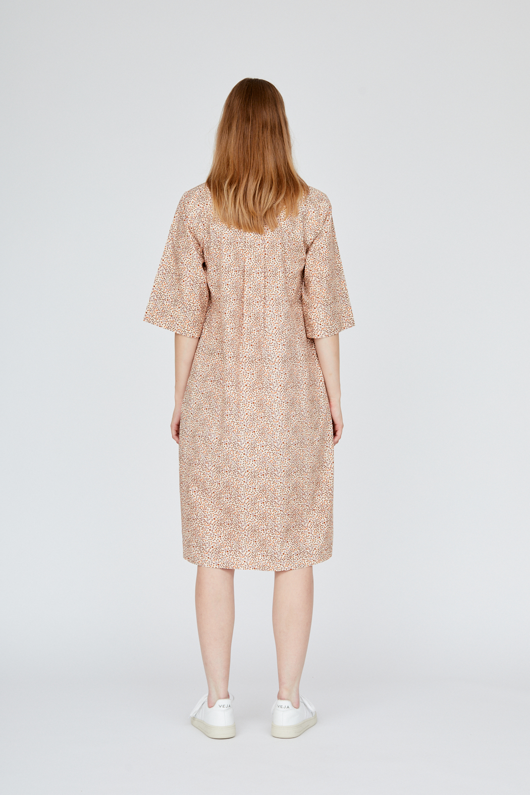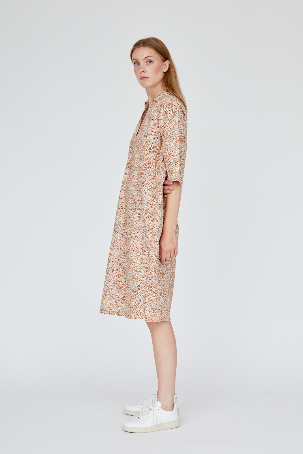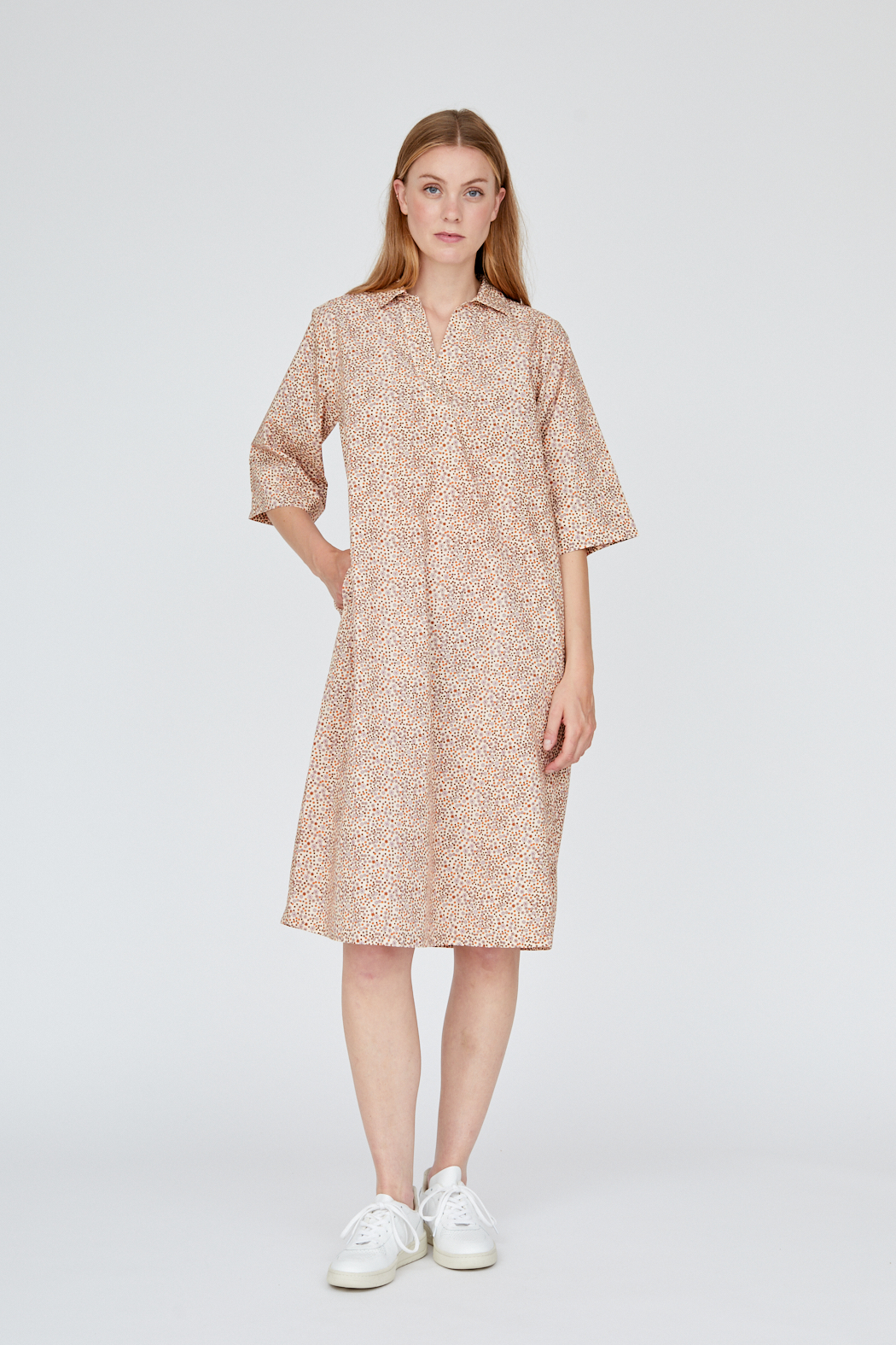 Unser Hazel Dress ist aus 100 % Bio-Baumwolle gefertigt und GOTS-zertifiziert. Es hat einen Polokragen, ellenbogenlange Ärmel und Taschen an jeder Seite. Kombinieren Sie es mit Sneakers für einen coolen Alltagslook.