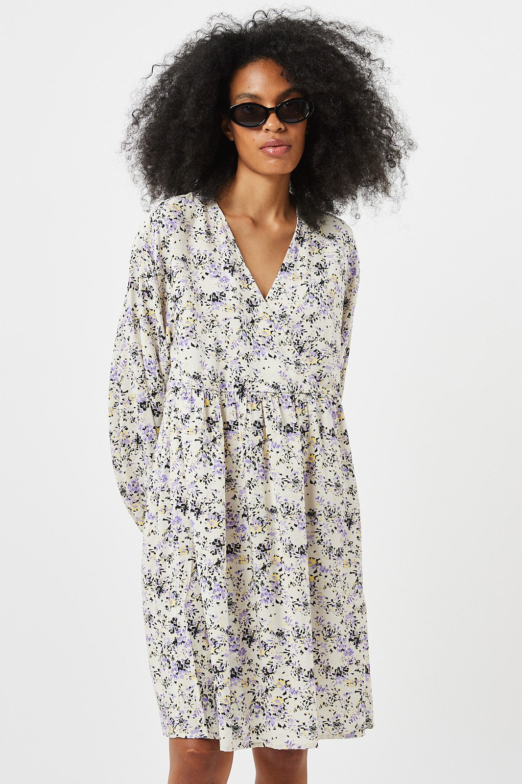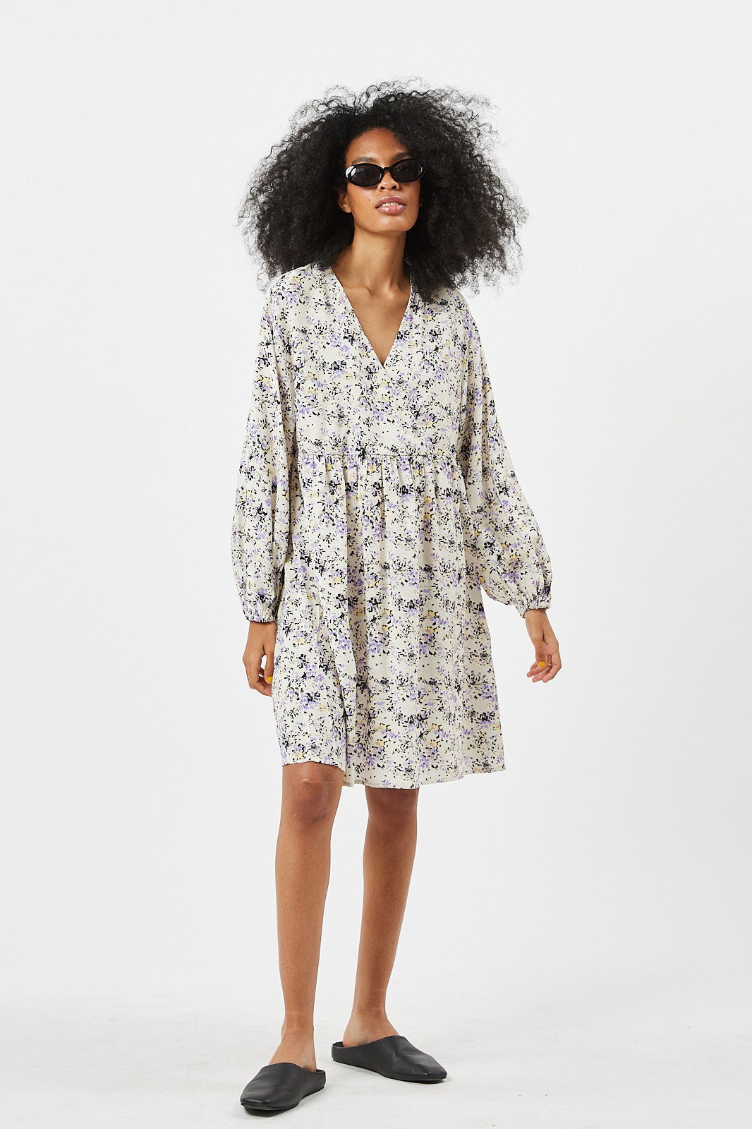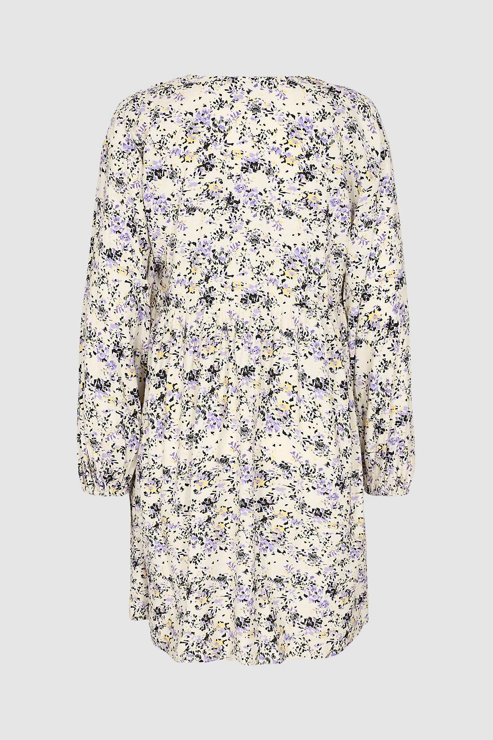 Modiva 9744 ist ein kurzes Kleid aus Polyamid und lenzing™ecovero™viscose für eine weiche und leichte Qualität. Das Kleid hat eine lockere Passform und verfügt über lange, voluminöse Ärmel, einen V-Ausschnitt und einen Saum unterhalb der Brust. Es ist mit einem abstrakten floralen Muster gestaltet. Das Model ist 176 cm groß und trägt Größe 36.