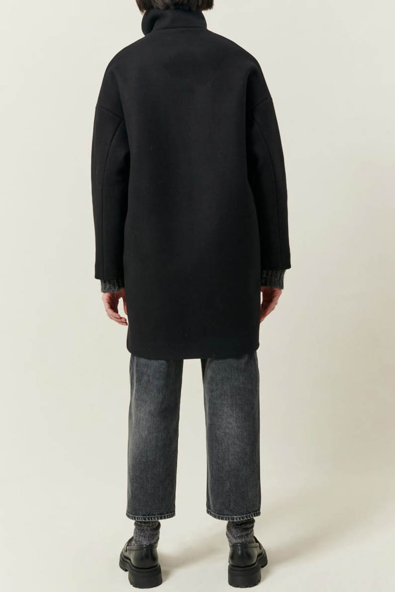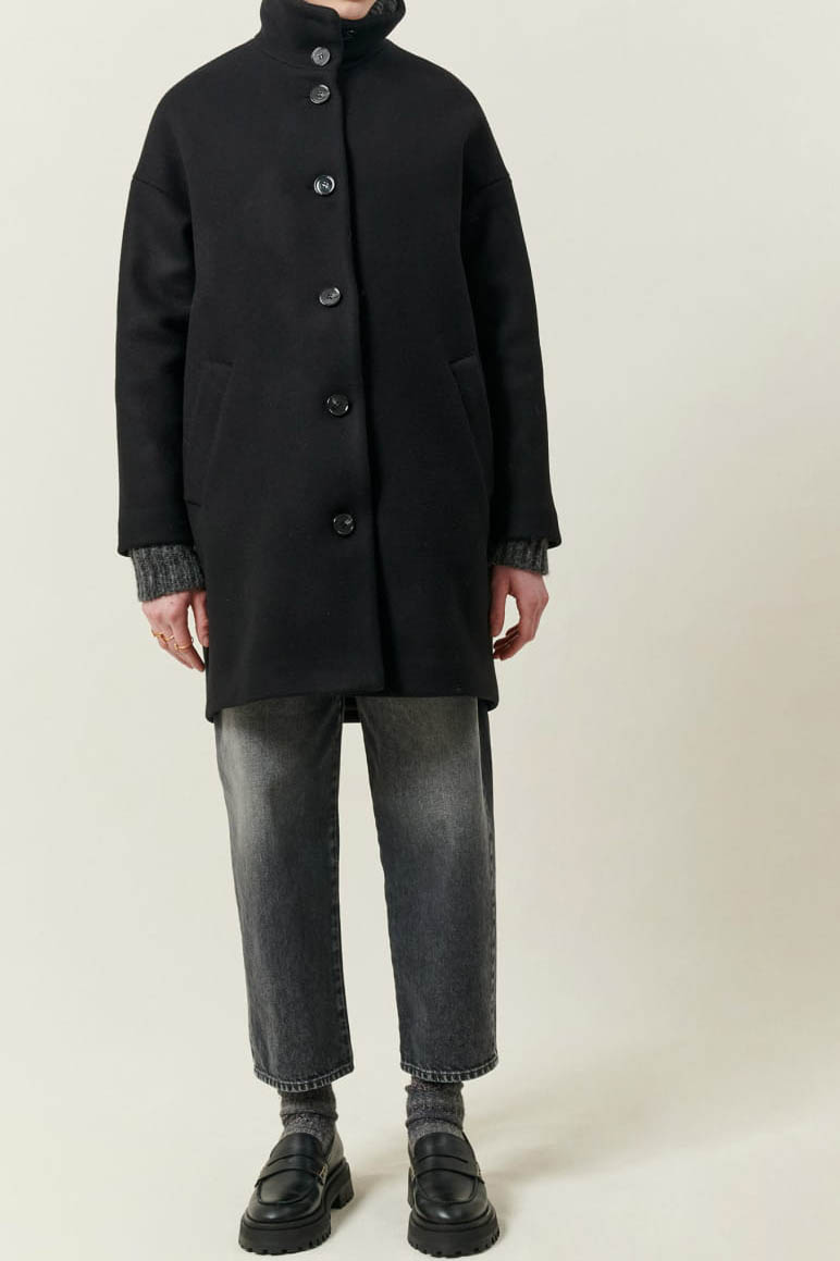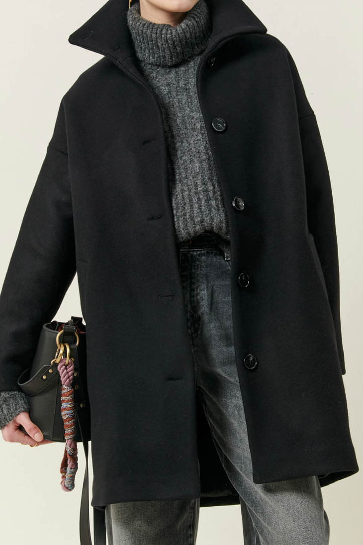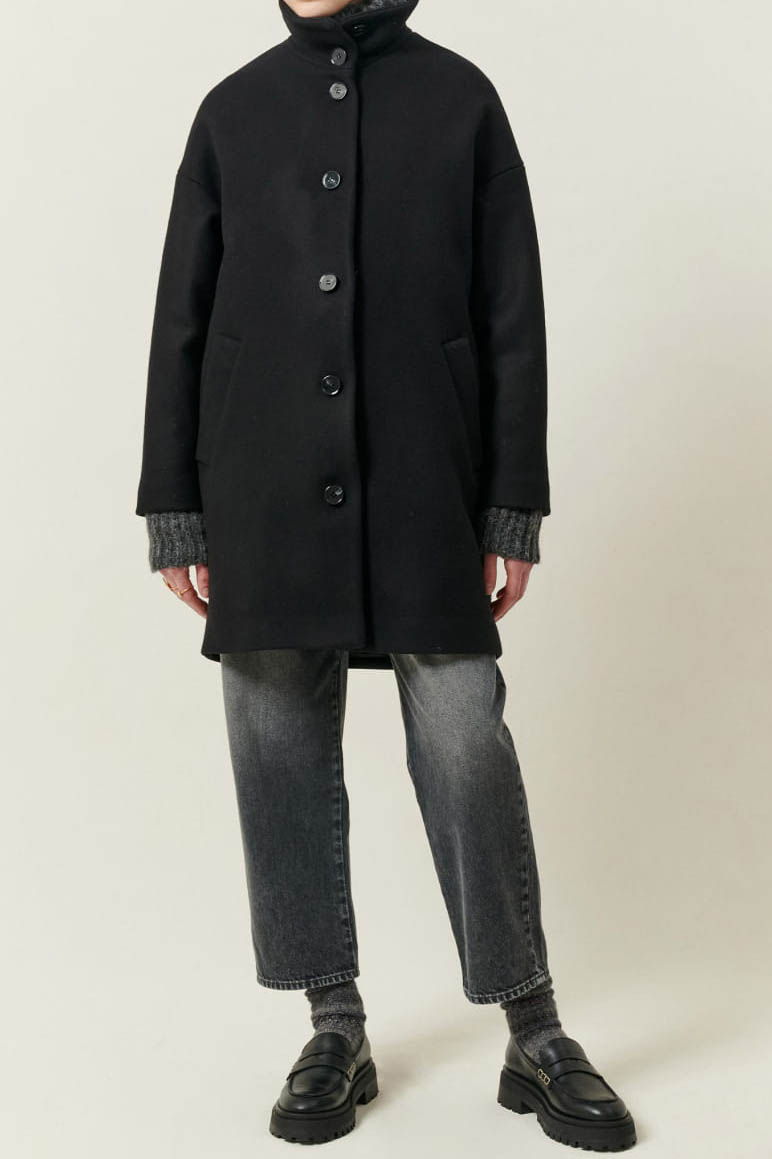 Gerade geschnittener, halblanger Mantel mit Stehkragen aus meliertem, in Italien doppelt gewebtem Twill.